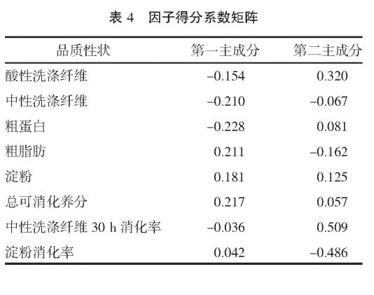 由表3得知,兩個主有效成分的累計增長率為73.404%,在其中,第一主有效成分的增長率為53.251%,對第一主成份奉獻(xiàn)最大的的是總可消化營養(yǎng)物質(zhì),荷載數(shù)值0.960,次之為中性化清洗化學(xué)纖維、粗蛋白質(zhì)、木薯淀粉和粗蛋白質(zhì),組成了青儲玉米自交系中的營養(yǎng)元素因素;第二主有效成分的增長率為20.152%,對第二主成份奉獻(xiàn)最高的為中性化清洗化學(xué)纖維30h吸收率,其荷載數(shù)值0.800,次之是木薯淀粉吸收率,組成了青儲玉米自交系營養(yǎng)元素的吸收率。從而能夠看得出,危害青儲玉米自交系質(zhì)量特性先后是:總可消化營養(yǎng)物質(zhì)(0.960)、中性化清洗化學(xué)纖維(-0.934)、粗蛋白(-0.922)、木薯淀粉(0.847)、粗蛋白質(zhì)(0.804)、中性化清洗化學(xué)纖維30h吸收率(0.800)和木薯淀粉吸收率(-0.759)。