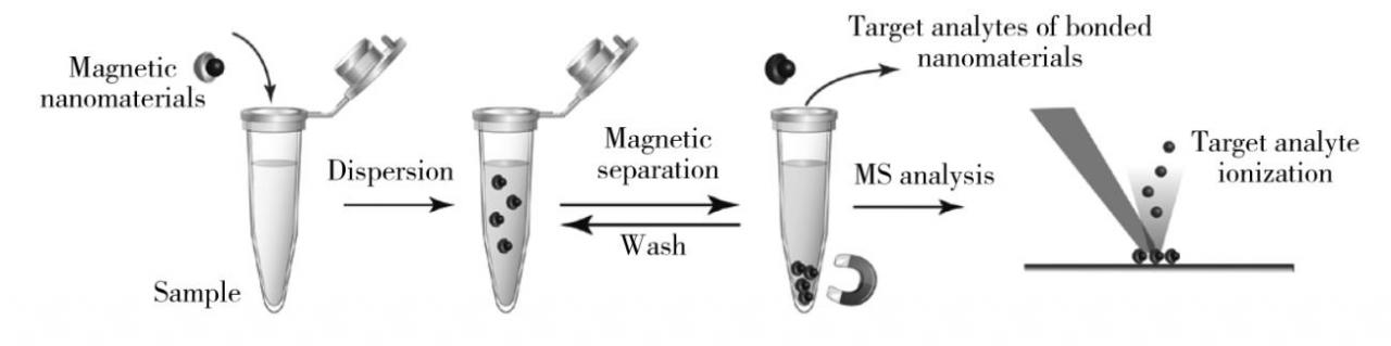 Fig.3 Sample pretreatment and analysis process of magnetic matrix applied to laser based ionization source