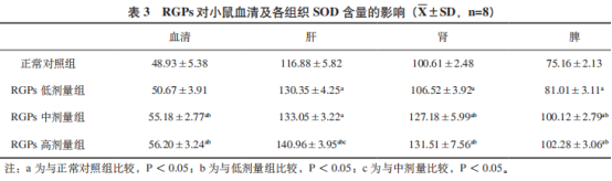 SOD是身體內(nèi)純天然具有的超氧自由基消除因素,它還可以把有毒的超氧自由基變?yōu)殡p氧水,隨后過氧化氫酶和乳酸脫氫酶將其徹底溶解為無毒的水,因而SOD在體細胞不受空氣氧化損害的環(huán)節(jié)中起了關(guān)鍵功效。從表3能夠看得出,RGPs3個使用量組均可提升血清蛋白和各機構(gòu)中SOD的活力,并展現(xiàn)使用量關(guān)聯(lián),在其中RGPs高使用量組對血清蛋白和肝、腎、脾中SOD的活力各自提升了14.86%、20.6%、30.71%和36.08%。持續(xù)灌胃小白鼠30天后,與常規(guī)對照實驗對比,RGPs小劑量組使血清蛋白中SOD的活力提升,無明顯差別,對結(jié)構(gòu)中SOD活力提升具備差別顯著性差異。RGPs中、高使用量組均能明顯提升血清蛋白和各機構(gòu)中SOD的活力。RGPs中、低2個使用量組對提升肝組織化中的SOD活力無明顯差別。