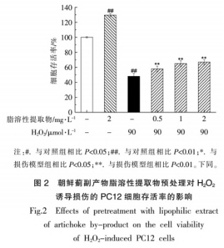與空白對照組相比,90μm01/LH202處理PCI2細(xì)胞4h后,細(xì)胞存活率為48.05%(圖2)。經(jīng)脂溶性提取物預(yù)處理后,H202對PCI2細(xì)胞的損傷作用受到顯著抑制(P<0.01),其中2mg/L的脂溶性提取物預(yù)處理細(xì)胞8h后,細(xì)胞存活率達(dá)到66.90%,因此在一定質(zhì)量濃度范圍內(nèi),脂溶性提取物都可以顯著保護(hù)PCI2細(xì)胞免受H202的損害作用。