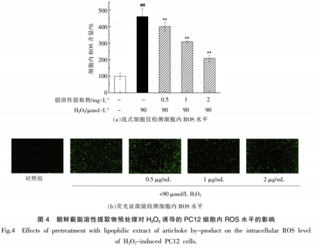 ROS主要來(lái)源于損傷的線粒體,當(dāng)細(xì)胞內(nèi)產(chǎn)生過(guò)量的ROS或體內(nèi)氧化劑含量超過(guò)細(xì)胞的抗氧化應(yīng)答能力時(shí),細(xì)胞就會(huì)產(chǎn)生氧化應(yīng)激。本試驗(yàn)以DCFH-DA作為熒光探針,檢測(cè)2’,7’-二氯熒光素(DCF)的熒光強(qiáng)度即可獲知細(xì)胞內(nèi)ROS的水平。與空白對(duì)照組相比,90μmol/LH202處理PCI2細(xì)胞4h后,細(xì)胞內(nèi)ROS水平顯著增加(P<0.01),達(dá)到460.43%(圖4a),使細(xì)胞產(chǎn)生嚴(yán)重的氧化損傷;經(jīng)脂溶性提取物預(yù)處理后,能夠顯著地抑制PCI2細(xì)胞內(nèi)ROS的產(chǎn)生(P<0.01),其中2mg/L脂溶性提取物預(yù)處理細(xì)胞8h后,ROS含量為208.37%。熒光顯微鏡觀察染色后的PCI2細(xì)胞發(fā)現(xiàn),細(xì)胞呈現(xiàn)的熒光強(qiáng)度變化與細(xì)胞內(nèi)ROS水平變化趨勢(shì)一致(圖4b)。因此,脂溶性提取物可以有效地清除ROS,緩解H202引發(fā)的線粒體功能障礙。