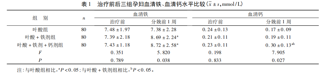 治療前,三組孕婦血清鐵、血清鈣水平間差異無統(tǒng)計學意義(P>0.05);分娩前1周,血清鐵、血清鈣水平在三組孕婦間差異有統(tǒng)計學意義(P<0.05),其中葉酸+鐵劑組、葉酸+鐵劑+鈣劑組血清鐵水平明顯高于葉酸組,差異有統(tǒng)計學意義(P<0.05);葉酸+鐵劑+鈣劑組血清鈣水平明顯高于葉酸組、葉酸+鐵劑組,差異有統(tǒng)計學意義(P<0.05)。見表1。
