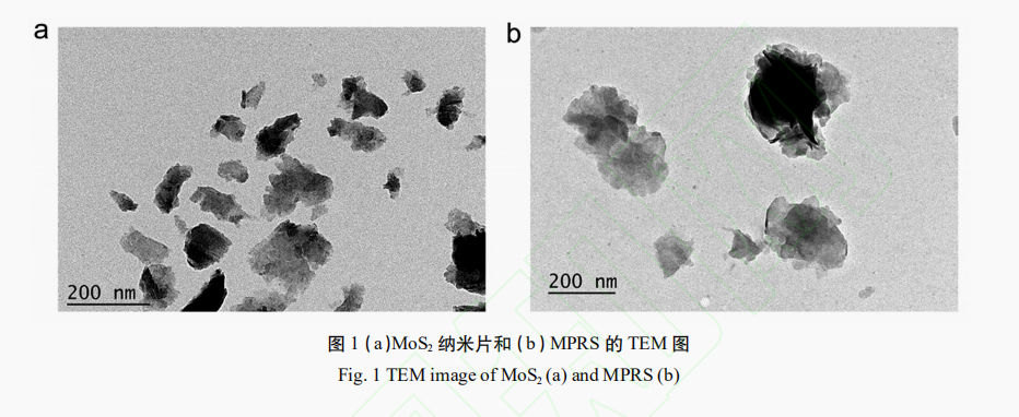 1.2.8 材料表征使用TEM觀察制備的MoS2和MPRS的形貌。使用X-射線光電子能譜儀對MoS2、MP、MPR、MPRS進(jìn)行測試分析。使用納米粒度電位儀測試MoS2、MP、MPR、MPRS和MPRS-DOX的粒度分布和電位。采用紫外-可見分光光度計對MPRS的載藥情況進(jìn)行測試。采用熒光分光光度計測試MPRS-DOX釋放DOX的情況。