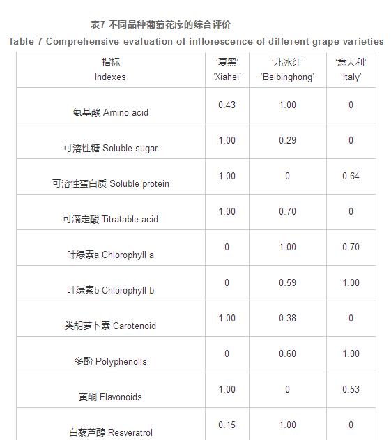 氨基酸、多酚、黃酮、花青素、綠原酸等是評(píng)價(jià)葡萄花序營(yíng)養(yǎng)品質(zhì)優(yōu)劣的重要指標(biāo),因而在進(jìn)行營(yíng)養(yǎng)評(píng)價(jià)時(shí)要有一定的選擇性?;ㄐ虻挠猛緩V泛,但評(píng)價(jià)分析的指標(biāo)不一,在評(píng)價(jià)花序的藥用價(jià)值時(shí),要綜合考慮功能活性成分中的多酚、黃酮、綠原酸等含量。若將花序作為一種食品,就要考慮蛋白質(zhì)、花青素、總糖、總酸等指標(biāo),并對(duì)花序品質(zhì)進(jìn)行排序,選出優(yōu)良的的花序品種,為花序的開發(fā)和優(yōu)良品種的選育提供參考依據(jù)。