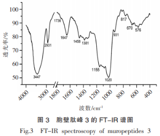 對(duì)胞壁肽3號(hào)峰單峰收集,冷凍干燥后進(jìn)行傅里葉變換紅外光譜分析,紅外光譜圖見(jiàn)圖3所示,從圖中可以看出,在2個(gè)區(qū)域存在強(qiáng)吸收,一個(gè)是~3447cm-1,另一個(gè)是~1020cm-1。肽鏈的幾個(gè)特征帶包括酰胺A帶(~3500cm-1)、酰胺Ⅰ帶(1600~1700cm-1)和酰胺Ⅱ帶(1510~1580cm-1)。酰胺A帶主要是N-H伸縮振動(dòng),對(duì)氫鍵非常敏感;酰胺Ⅰ帶是肽鏈的主要特征帶,主要是C=O和C-N的伸縮振動(dòng);而酰胺Ⅱ帶主要是N-H面內(nèi)變角振動(dòng),以及C-N和C-C的伸縮振動(dòng)。糖環(huán)的特征峰集中在800cm-1~1200cm-1之間,包括C-OH的伸縮振動(dòng)和糖苷鍵C-O-C的振動(dòng)疊加吸收信號(hào)。峰3的紅外光譜的吸收峰歸類(lèi)見(jiàn)表1所示,從表中可以看出,胞壁肽3號(hào)峰包涵糖肽的典型基團(tuán)振動(dòng)特征,一個(gè)是肽鏈的酰胺吸收帶,包括3447cm-1的酰胺A帶、1647cm-1的酰胺Ⅰ帶;另一個(gè)是在1200~800cm-1,1020cm-1是糖環(huán)以及糖苷鍵的特征吸收峰。因此,胞壁肽3號(hào)峰具有典型的糖肽結(jié)構(gòu)特征。
