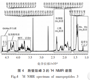 氫譜是所有核磁共振譜中靈敏度最高的,可以為化合物提供豐富的結(jié)構(gòu)信息。對(duì)胞壁肽3號(hào)峰的結(jié)構(gòu)進(jìn)行氫譜分析,檢驗(yàn)其是否與GlcNAcMurNAc-L-Ala-D-Glu-mesoDAP結(jié)構(gòu)相符。氫譜中各官能團(tuán)的化學(xué)特性主要體現(xiàn)在化學(xué)位移上,氫原子核外電子云密度越大,化學(xué)位移越小,出峰位置越靠近右方。1HNMR譜見(jiàn)圖4所示,從圖中可以看到典型的胞壁肽信號(hào)模式,糖肽官能團(tuán)本身的性質(zhì)、取代基等都會(huì)對(duì)物質(zhì)的化學(xué)位移產(chǎn)生影響,從而改變官能團(tuán)出峰位置,糖環(huán)和肽鏈表現(xiàn)不同的化學(xué)位移。在前人針對(duì)肽聚糖片段核磁分析的基礎(chǔ)上,對(duì)胞壁肽3號(hào)峰氫譜的化學(xué)位移進(jìn)行歸屬,GlcNAc、MurNAc和肽鏈氨基殘基的典型信號(hào)介于4.7×10-6~3.3×10-6之間,4.67是GlcNAc異頭碳原子上的質(zhì)子共振信號(hào);對(duì)于甲基和脂肪烴的亞甲基質(zhì)子化學(xué)位移介于2.5×10-6~1.1×10-6之間。綜合上述分析,胞壁肽峰3的1HNMR與目標(biāo)糖肽結(jié)構(gòu)相符。