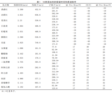 分析儀:LCMS-8050;離子源:電噴霧器離子源(ESI);掃描儀方法:正空氣負離子與此同時掃描儀;離子源插口工作電壓:0.5kV;做霧化氣:N23.0L/min;干躁氣:N210L/min;撞擊氣:氬氣;DL溫度:250℃;加熱器溫度:400℃;逐行掃描:多反映檢測(MRM);停留時間:15ms;時間延遲:3ms;16種添加物標準物質(zhì)MRM主要參數(shù)見表1。