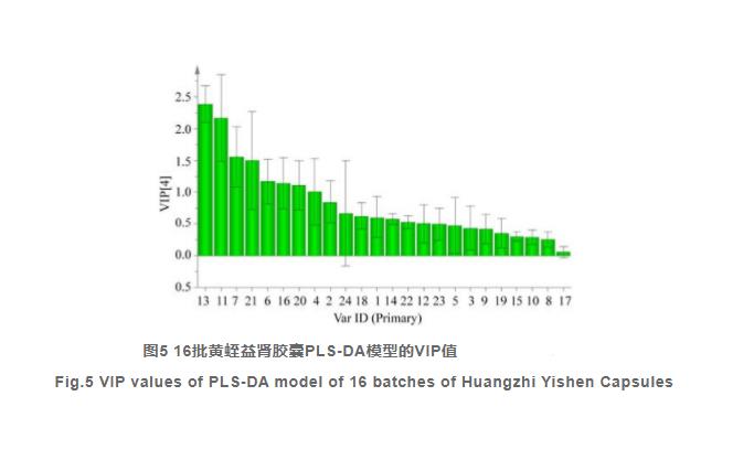 為了更好地進一步剖析導致不一樣批號試品中間差距的成分,在PCA的根基上開展PLS-DA解決。實體模型區(qū)別主要參數(shù)R2Y=0.966,模型預測主要參數(shù)Q2=0.91,說明創(chuàng)建的實體模型合理平穩(wěn)。一樣可將16批試品分成3類,進一步認證了HCA和PCA的結(jié)果;以PLS-DA實體模型中必要性投射(VIP)值>1.0挑選不一樣批號試品間的差異成份,VIP值的尺寸說明了對試品歸類的貢獻的水平。據(jù)圖5得知,共尋找八個成份,各自為:13號峰(黃芩異黃烷苷)、11號峰(人參皂甙Rg1)、花了7天時間峰(毛蕊大豆異黃酮葡萄糖水苷)、24號峰(7,2'-二甲基-3',4'-二叔丁基異黃烷)、六號峰(松香醇二紅提苷)、16號峰(毛蕊大豆異黃酮)、20號峰(芒柄花黃素)、11號峰(綠原酸),說明這8種成份對黃蛭益腎膠襄品質(zhì)差別危害很大。8種成份各自來自于黃芩、三七、益母草顆粒、墨旱蓮、菟絲子,在其中五個成份屬于君藥黃芪藥材,進一步表明黃芪藥材對黃蛭益腎膠襄的品質(zhì)危害很大。