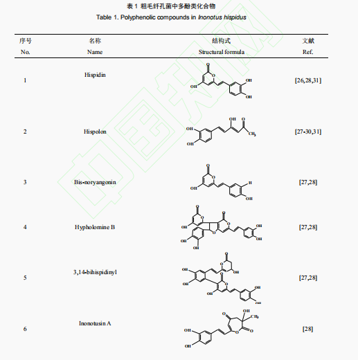 昝立峰等從內(nèi)寄生于水曲柳木的粗毛纖孔野生菌實(shí)體線工業(yè)甲醇提取液中剝離獲得Hispolon、Hispidin、InonotusinA、InonotusinB、4-(3,4-二羥苯基)-3-丁烯-2-酮、InoscavinC、InoscavinD及原兒茶醛和原兒茶酸9個(gè)多酚類物質(zhì),在其中化學(xué)物質(zhì)InonotusinA、Inonotusin B為2個(gè)新化學(xué)物質(zhì)[28]。白楊樹東等對(duì)粗毛纖孔菌科學(xué)研究,在其工業(yè)甲醇提取液中剝離獲得多酚類4-(3,4-二羥苯基)-3-丁烯-2-酮、phellibauminA、3,3?-甲基雙[6-[2-(3,4-二羥苯基)甲基丙烯酸酯]-4-甲基-2H-吡喃-2-酮](MBP)、肌苷、原兒茶酸和原兒茶醛。李慶杰從粗毛纖孔野生菌實(shí)體線中剝離獲得5個(gè)多酚類,各自為phellibauminA、phelligridinC、phelligridinC′和phelligridinD,3?4 ?-dihydroxy-5-[11-hydroxyphenyl]-6,7-vinyl]-3,5-dioxa-fluoren-5-one。在其中phelligridinC、phelligridinC′是順?lè)串悩?gòu)體,3’4’-dihydroxy-5-[11-hydroxyphenyl]-6,7-vinyl]-3,5-dioxa-fluoren-5-one(19)和反式的phelligridinC′為2個(gè)新化學(xué)物質(zhì)。