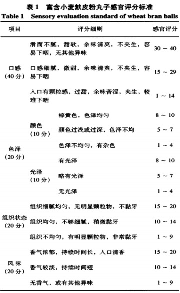 點評工作組為10人,五男五女,均受到技術(shù)專業(yè)的感覺點評學(xué)習(xí)培訓(xùn)。鑒定在感觀試驗室內(nèi)開展,依據(jù)小麥麩皮粉肉丸子的口味、顏色、機構(gòu)模式及口味制訂感觀標準。感觀評定標準參照有關(guān)文獻資料并稍作改動,見表1。