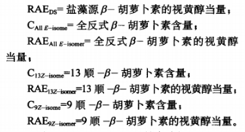 因為鹽藻源β-胡羅卜素成分帶有多種多樣幾何圖形同分異構(gòu)體,其視黃醇劑量可按式(10)測算。因為各順式同分異構(gòu)體的視黃醇劑量末見報導(dǎo),鹽藻源β-胡羅卜素的視黃醇劑量現(xiàn)階段不明。