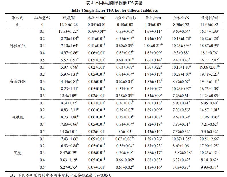 由表得知,阿拉伯膠對(duì)試品黏附性危害超過其他添加物,當(dāng)阿拉伯膠加上量為0.1%、0.2%和0.3%三個(gè)水準(zhǔn)時(shí),紅薯粉試品的強(qiáng)度、黏附性、延展性、膠黏性做到最高值,各自為18.70N、0.11mJ、1.94mm和10.23N,明顯高過別的水準(zhǔn)(p<0.05),表明阿拉伯膠在加上水準(zhǔn)0.1%~0.3%中間,對(duì)試樣的疑膠特性提高較大