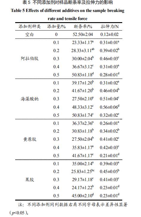 2.3不一樣添加物對(duì)紅薯粉斷條率、拉申力的危害