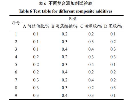 依據(jù)單要素試驗(yàn)結(jié)果,挑選不一樣添加物水準(zhǔn),依據(jù)正交試驗(yàn)中四要素三水準(zhǔn)的方式 ,開展混配添加物試驗(yàn),試驗(yàn)編號(hào)如表6所顯示。但在操作過程中,發(fā)覺依照原使用量配備復(fù)合型添加物時(shí),存有木薯淀粉漿過稠,沒法開展糊化的難題,故在開展復(fù)合型添加物配備時(shí),將全部使用量按占比減至原四分之一開展試驗(yàn)。